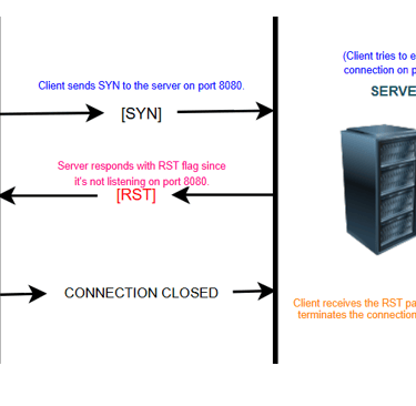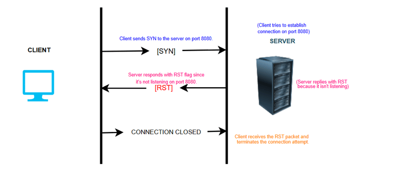 Example: A client attempts to connect to a server on port 8080, but the server is not listening on that port. The server will respond with a TCP segment containing the RST flag.